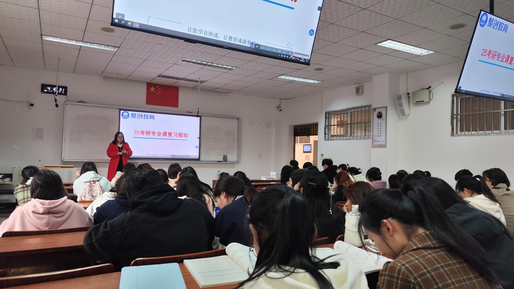本次讲座由优秀校友企业——聚创考研的胡路老师主持。讲座内容涵盖了考研政策解读、学科知识点梳理、复习方法和心理调适等方面。主讲老师胡路首先讲述了备战考研中会遇到的问题,随后讲述专业科目考试是怎样进行的,考试中发放的信封拆封注意事项,胡路老师还向同学们分享了一些寻找考研复习资料的途径,助力同学们的考研复习。最后,胡路老师还分享了自己这些年遇到的一些考生的错误复习方式,告诫同学们要选对复习科目,不然到头来复习成果只能是“竹篮打水一场空”。