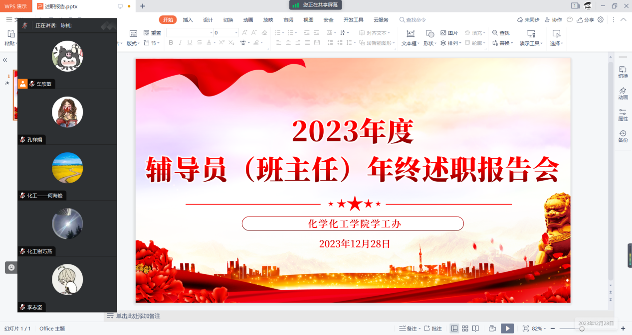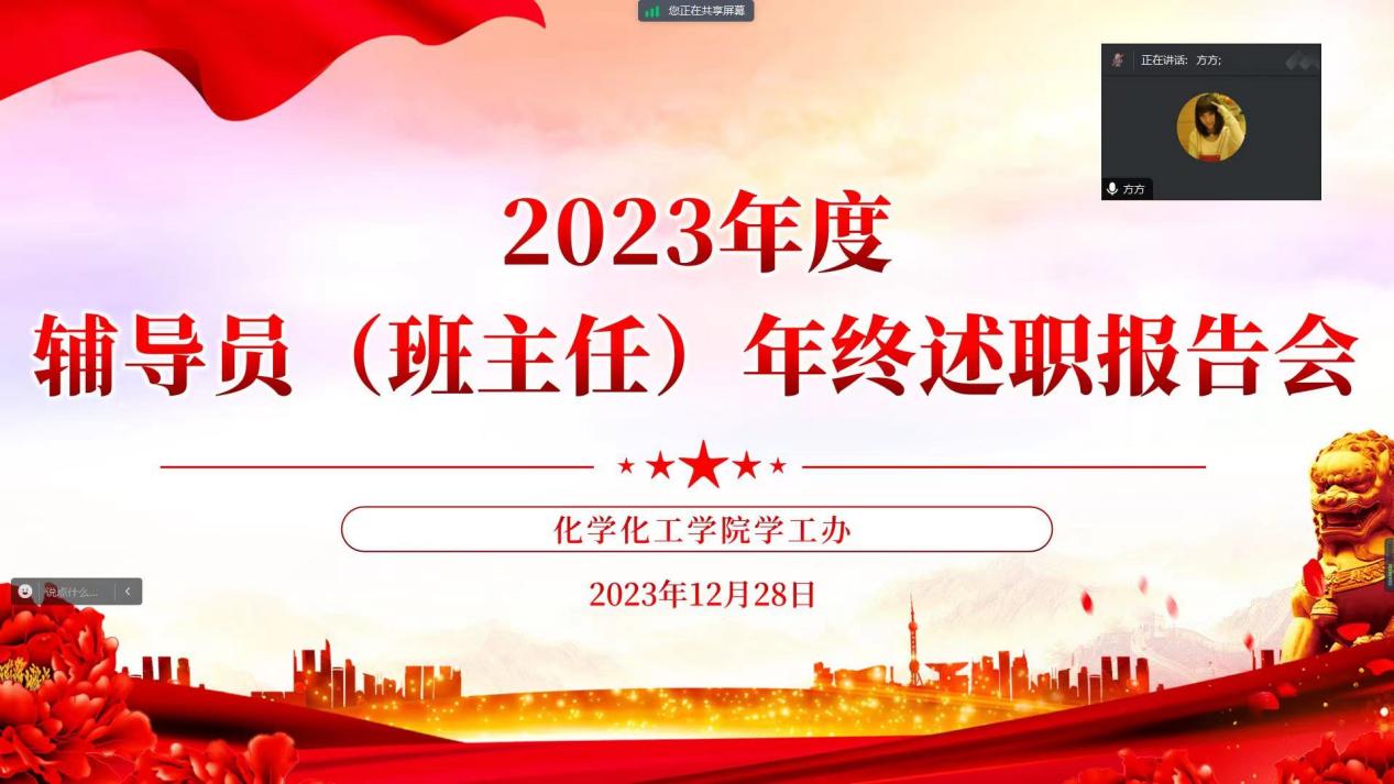 会议历时3小时,包括研究生辅导员(班主任)在内的25名老师围绕2023年的工作情况依次进行述职汇报。在过去的一年中,各位辅导员(班主任)老师坚持以立德树人为根本任务,以推进三全育人为抓手,以提升学生工作精细化管理和优质化服务水平为重点,围绕学生思想政治教育、学风建设、党团建设、学生素质提升、资助育人、心理健康教育、学生日常管理与服务、安全教育、就业指导等方面开展了一系列卓有成效的工作,以创新形式和手段不断拓展服务渠道和教育方式,全心全意助力学生成长成才,真正做到了学生逐梦路上的人生导师和知心朋友。