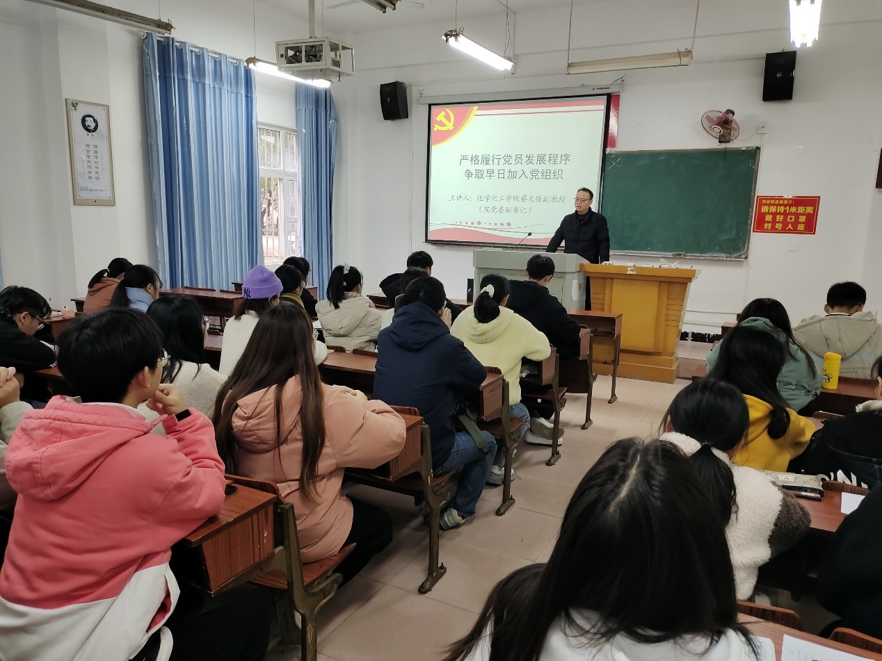 为了更好地引领青年大学生积极向党组织靠拢,让大学生对中国共产党有更加深刻的了解,2020年12月1日16时,必赢766net手机版第二十三期党课培训班在九栋教学楼9102开展了以“严格履行党员发展程序,争取早日加入党组织”为主题的党课培训。本次培训由必赢766net手机版党委副书记蔡文强副教授主讲,学院5名发展对象和30名入党积极分子参加培训。