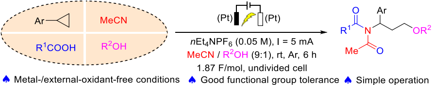 英文题目:Electrochemical 1,3-Alkyloxylimidation of Arylcyclopropane Radical Cations: Four-Component Access to ImideDerivatives