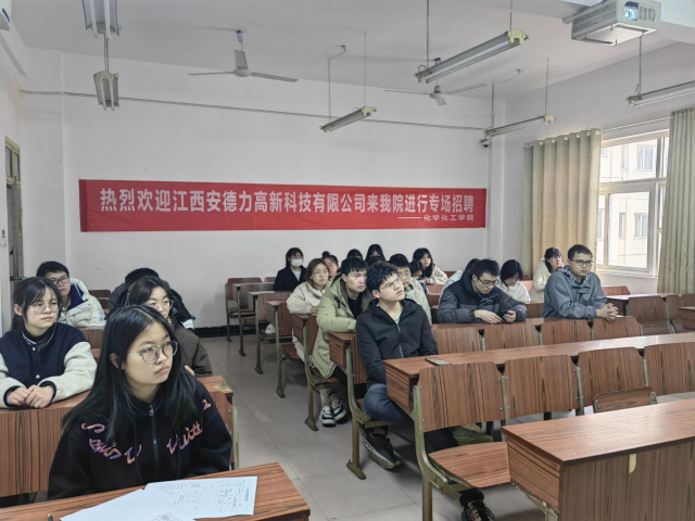 在做了充足的前期准备情况下,活动顺利展开。招聘宣讲会上,招聘单位人事专员傅希通过PPT向同学们展示了公司的基本情况,介绍了公司的发展过程,让同学们对其发展现状有所了解。紧接着介绍了公司的环境、生活条件,以及公司的日后规划,给予将被录用人员工作和生活上的保障。最后,讲述了公司的人才需求,本次招聘岗位主要为化学分析员、实验员以及生产技术员,欢迎大家踊跃报名。介绍完成后,同学们积极提问工作有关问题,如工作时长及公休等方面问题,宣讲人员也热情地为同学们答疑解惑,氛围十分融洽。此次招聘会圆满结束。