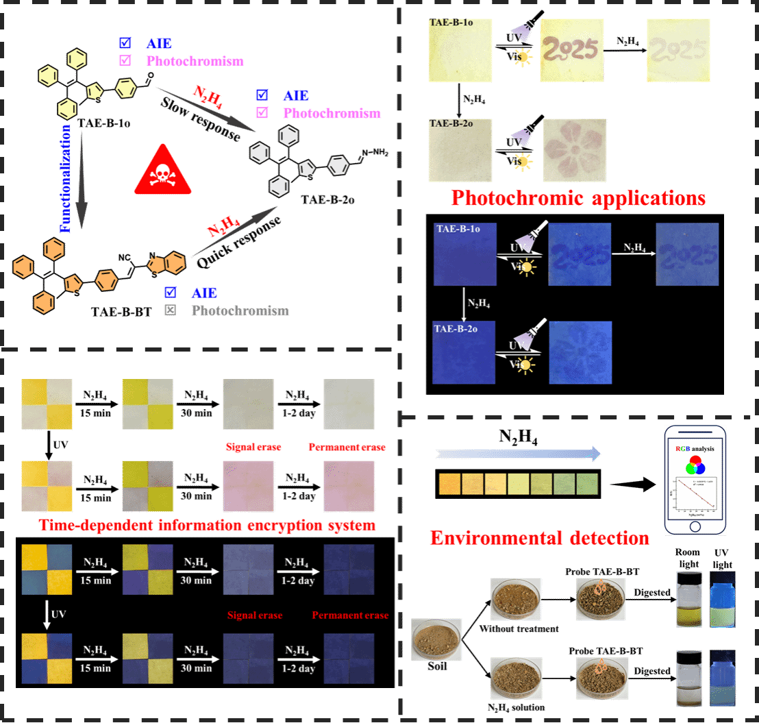 本研究设计合成了基于四芳基乙烯的荧光探针TAE-B-BT,其关键中间体TAE-B-1o和产物TAE-B-2o表现出显著的AIE效应和光致变色特性。该探针能高灵敏度实时检测N2H4,紫外-可见吸收和荧光光谱均发生显著变化,在液相、气态及土壤样品中均展现优异定量性能。基于其对N2H4和紫外光的双响应特性,成功构建了双输入双输出分子逻辑门系统。创新性地利用TAE-B-BT与TAE-B-10对N2H4的差异响应动力学,结合光致变色行为,开发出新型动态信息加密材料,实现了时控图案显示、紫外擦除及多模态(彩色/荧光)防伪验证。这种整合分子识别、光响应及时序调控的防伪策略,为高安全性材料开发提供了新范式。