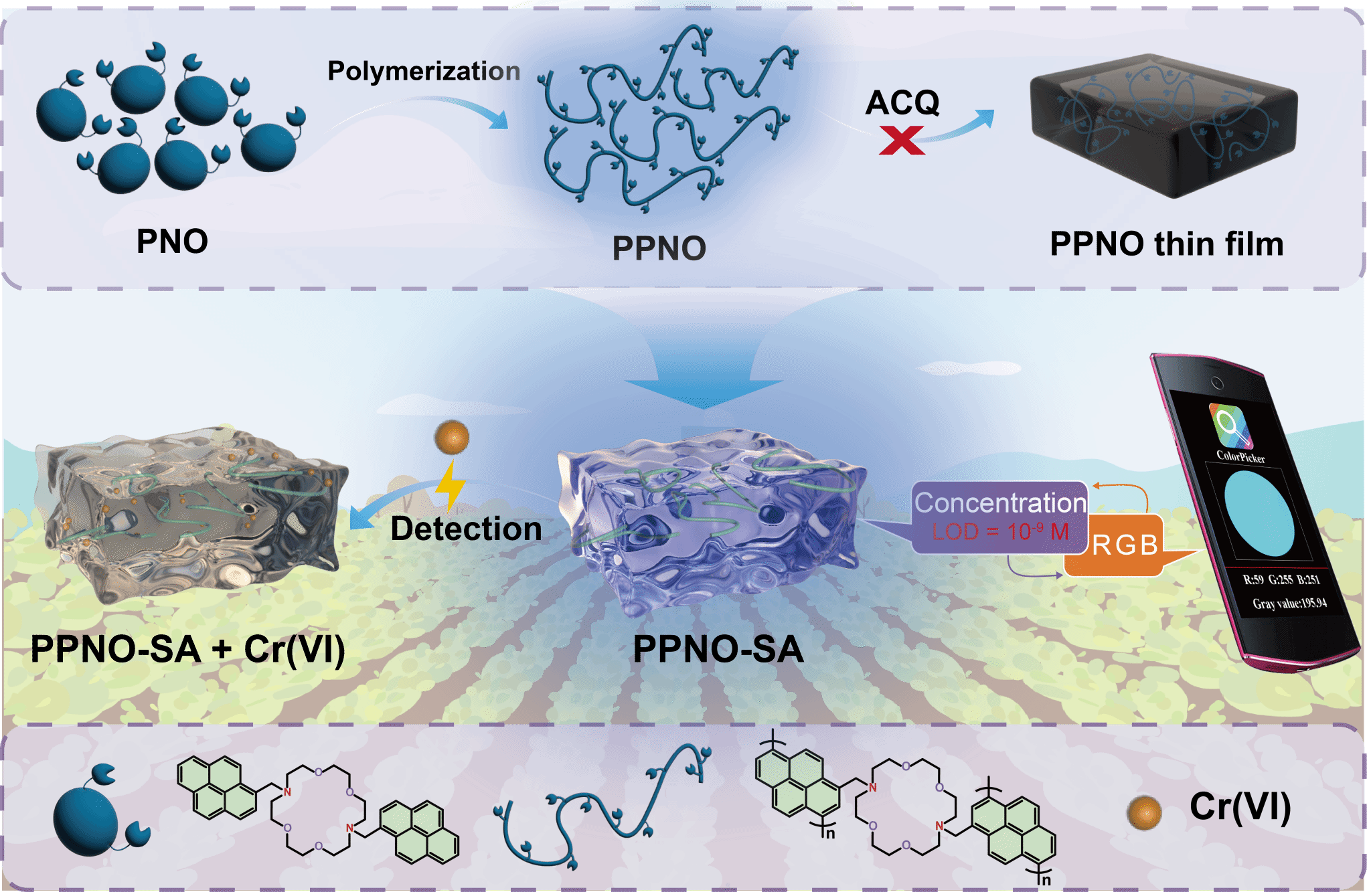 共轭聚合物凭借其独特的分子效应,在柔性光学传感器中展现出极高的灵敏度。然而,成膜后,分子间π-π堆积作用引发的弱松弛现象,不仅会降低其荧光强度,还会掩盖大量活性位点,从而阻碍传感器对分析物的快速响应。为应对上述挑战,本篇文章巧妙地将水凝胶与共轭聚合物相结合,攻克了共轭聚合物薄膜传感器在实际应用中长期存在的瓶颈问题。通过将传感功能与柔性水凝胶材料相集成,能够实现与基于智能手机的便携式平台的无缝对接,从而在不依赖大型实验室仪器的情况下,完成对六价铬(Cr(VI))的现场定量检测。这种设计实现了从“传感器作为一种材料”到“传感器作为一种器件”的转变,解决了高灵敏度与可现场部署实用性之间的权衡难题。